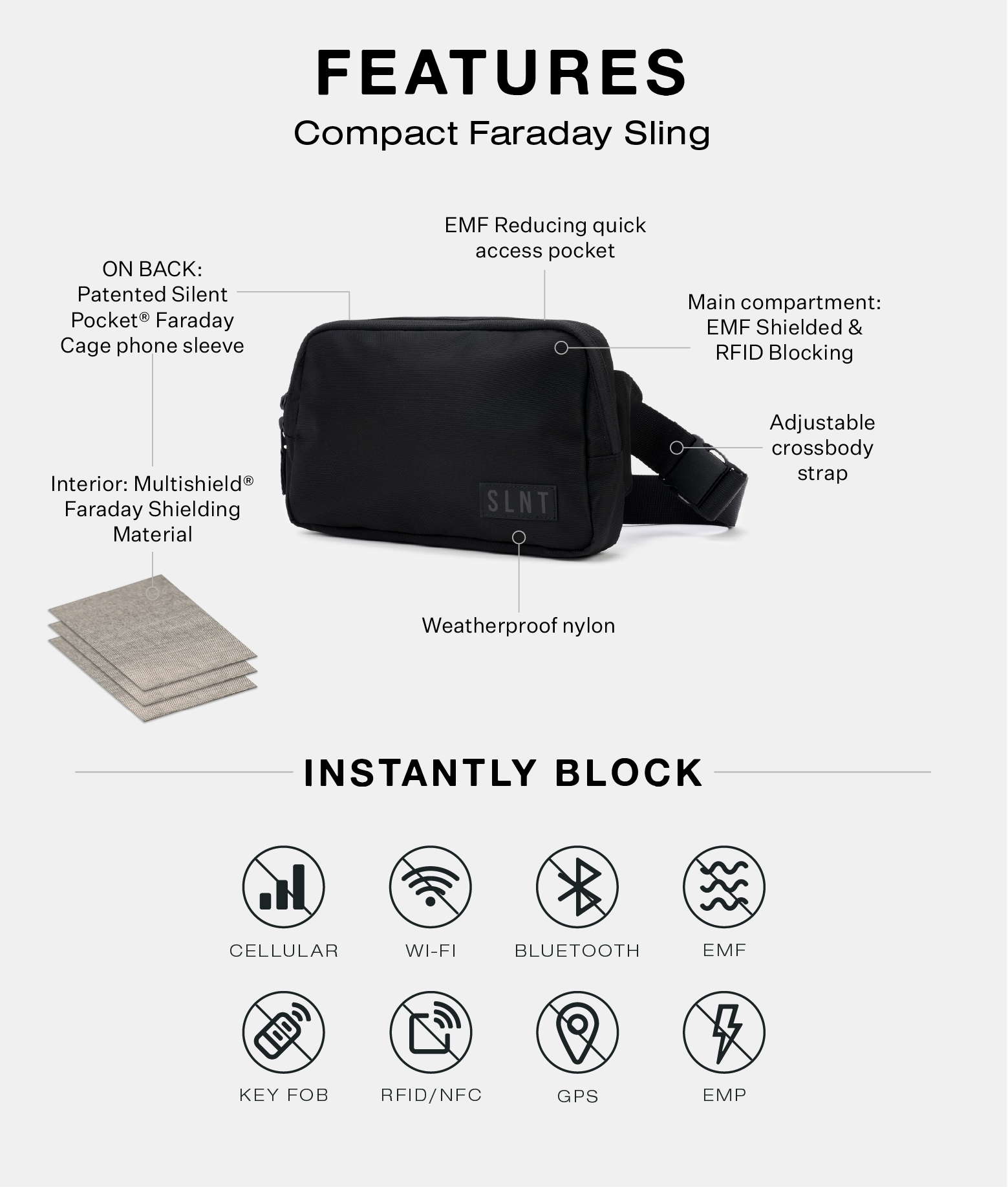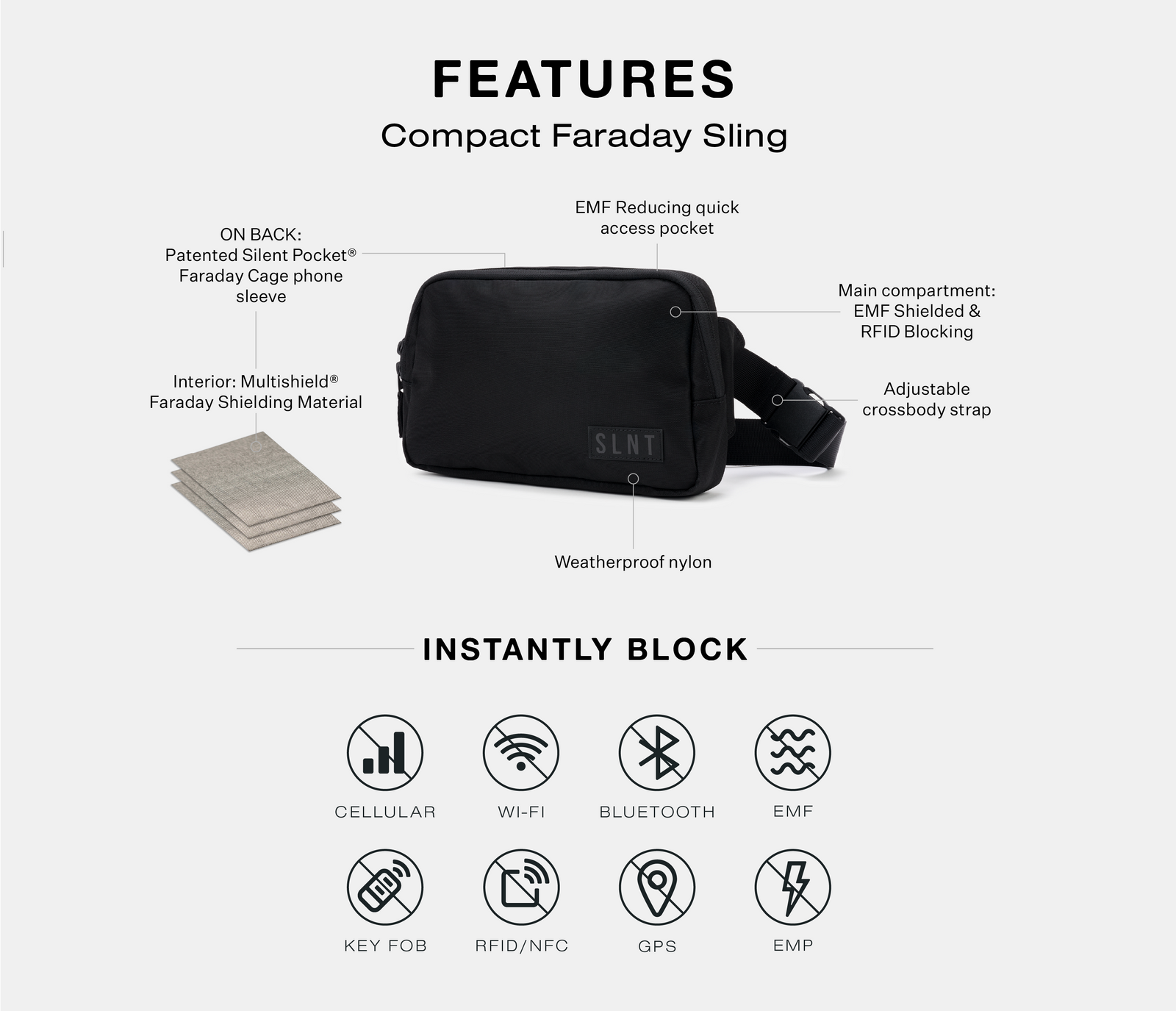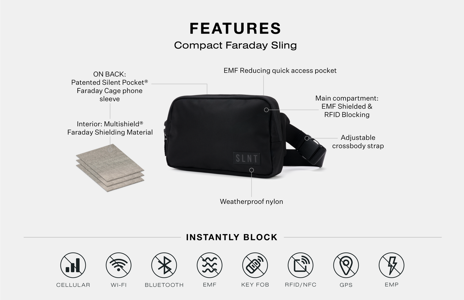 Switch between connectivity and disconnection with ease,while balancing function and protection. Featuring three distinct compartments, each serving a unique purpose. The front main compartment is lined with RFID-blocking technology, securing your credit cards and passport. Add your phone to reduce EMF exposure. The middle slip-in pocket provides quick access to your device while reducing EMF exposure. When it’s time to fully disconnect, the back features a patented signal-blocking Faraday cage, ensuring you’re untraceable, untrackable, and unhackable—all while blocking 100% of the EMF radiation emitted by your device.