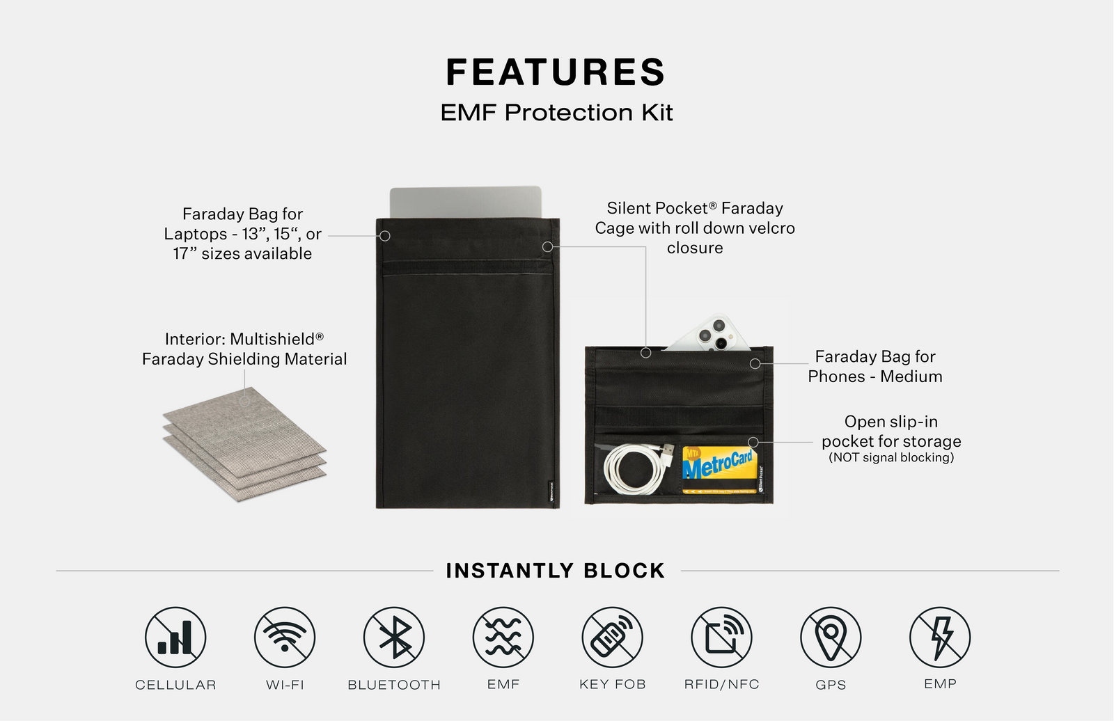 Silent Pocket® Faraday Technology Instantly Blocks: