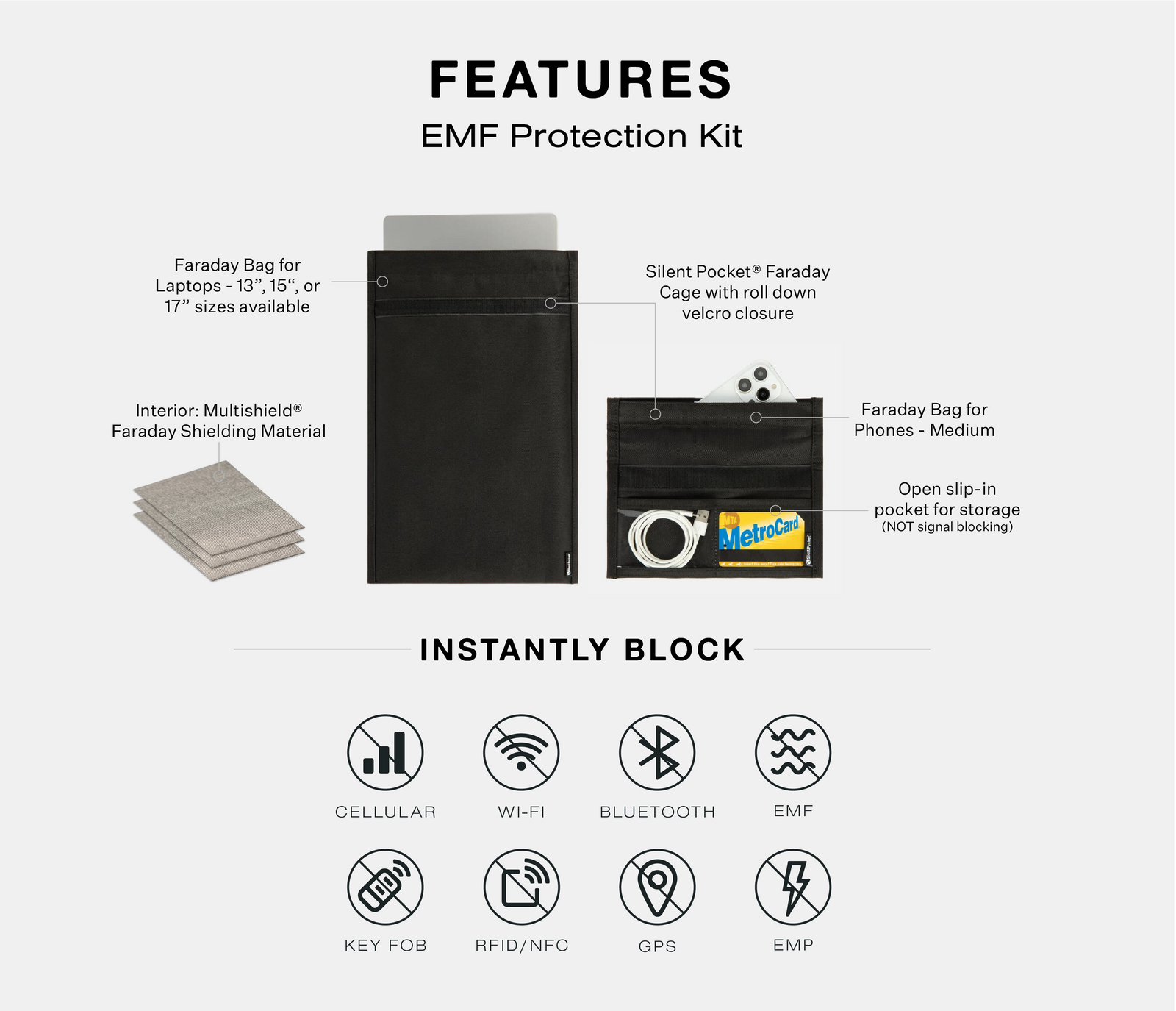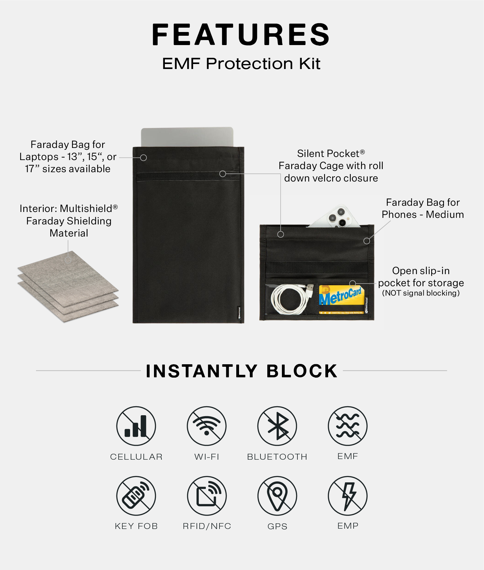 Instantly Block: Cellular, WiFi, Bluetooth, GPS, RFID, NFC, Satellite, Navigation, EMP, Solar Flare, Key Fob and EMF Radiation