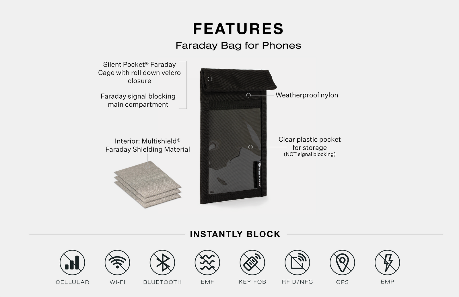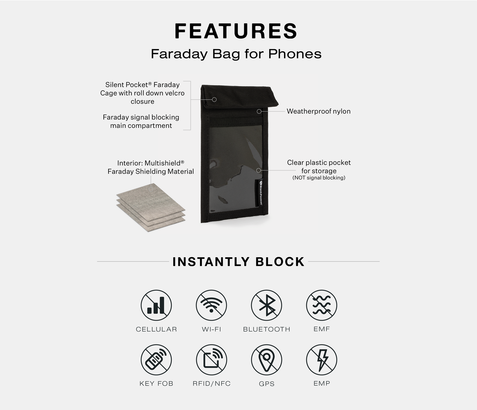 Silent Pocket® Faraday Technology Instantly Blocks: