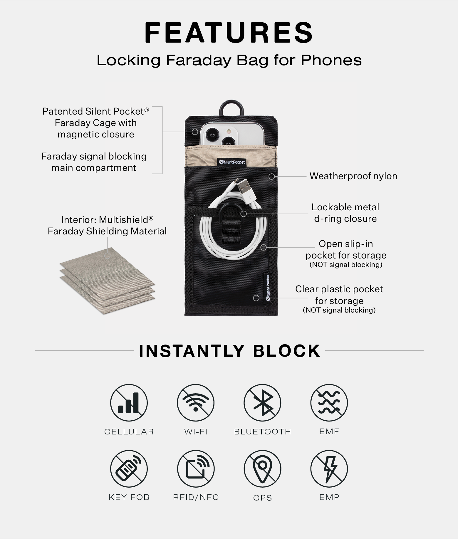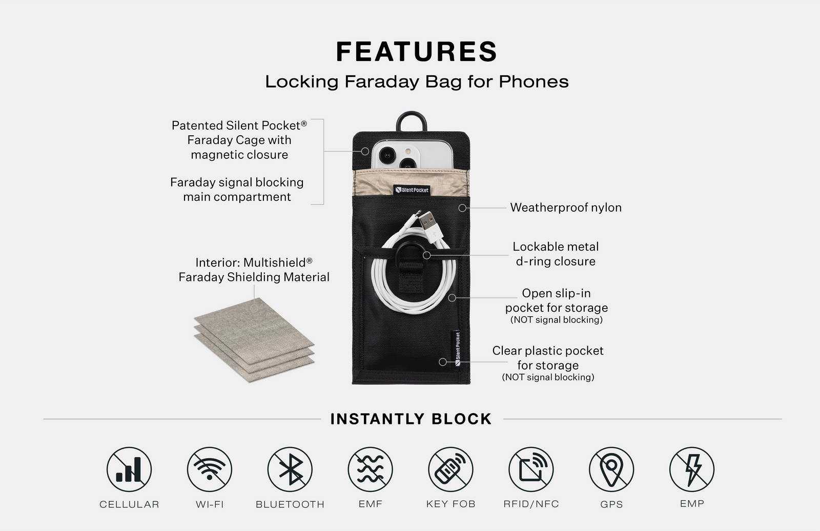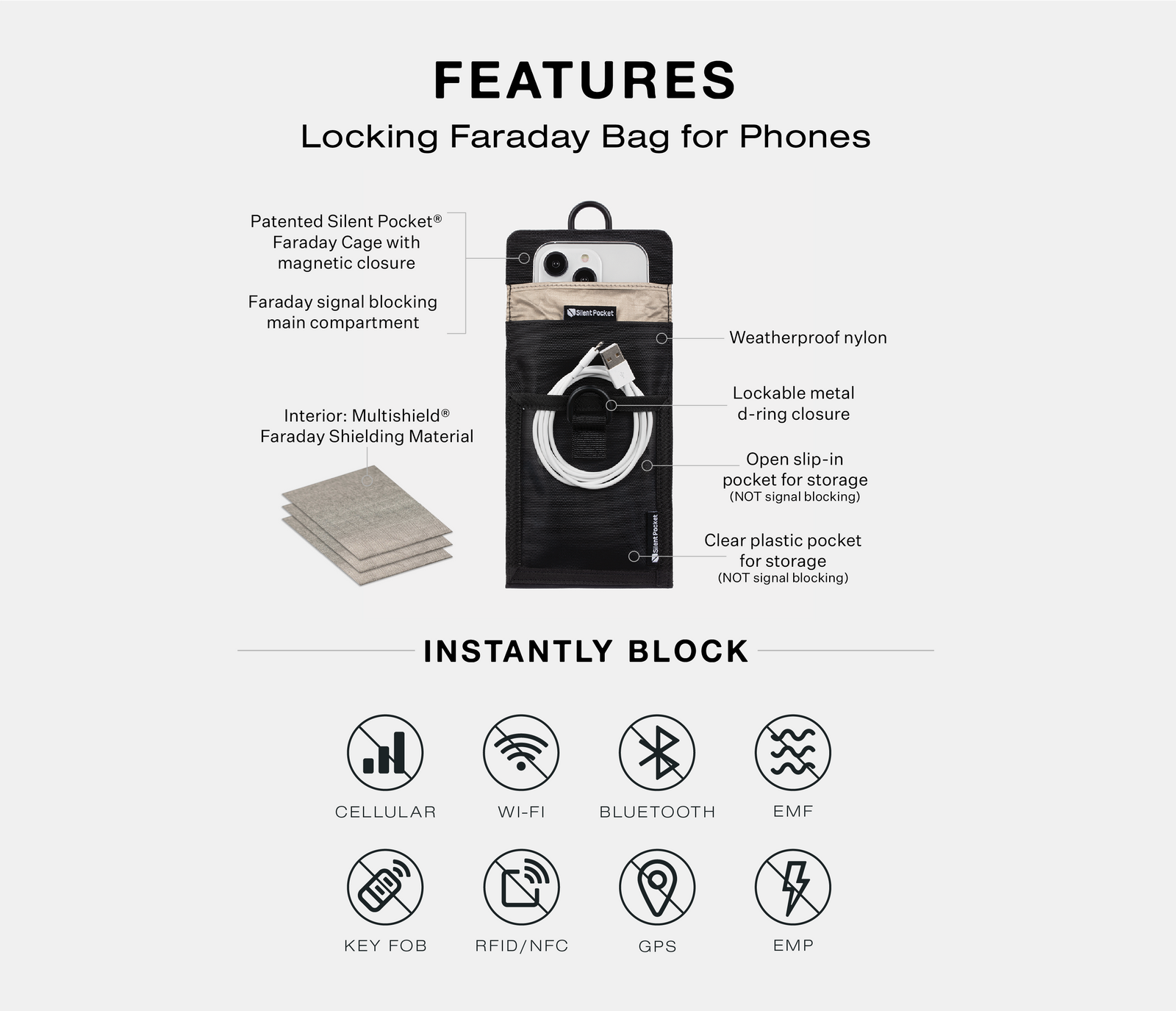 Silent Pocket® Faraday Technology Instantly Blocks: