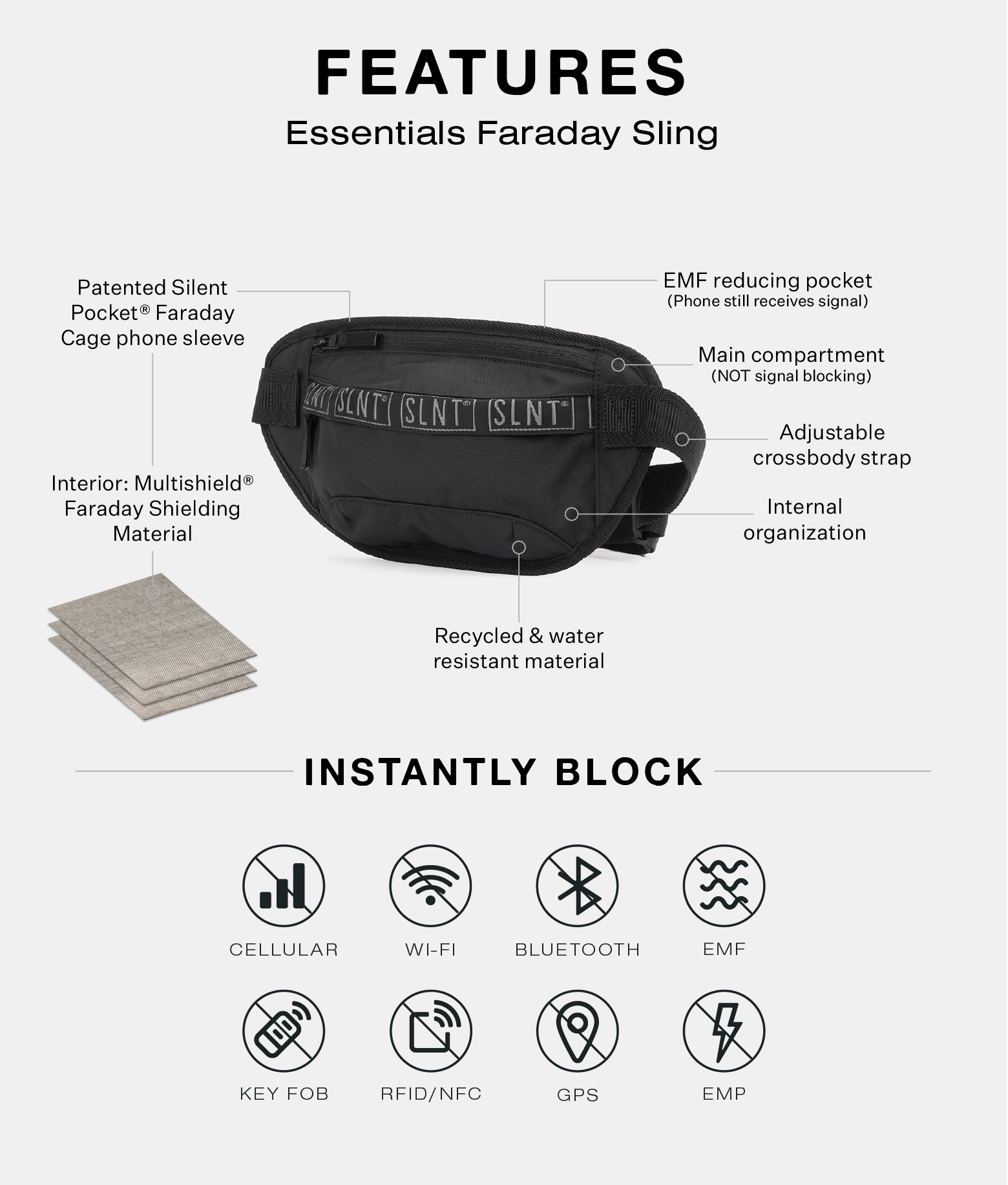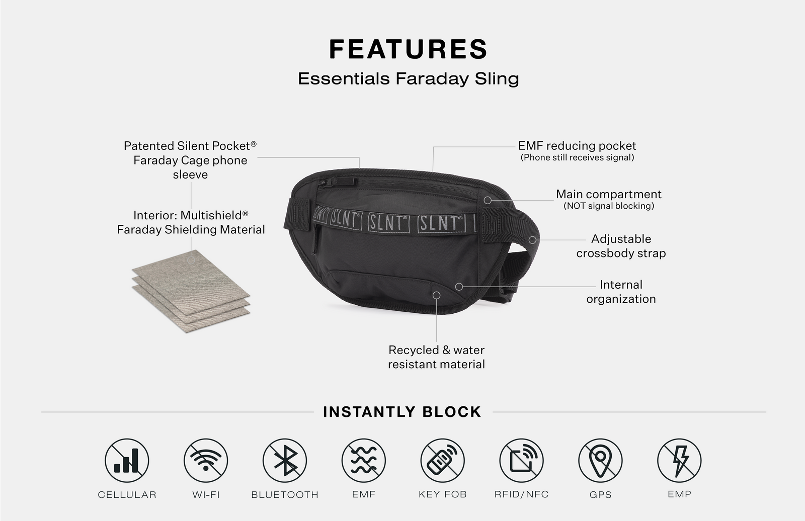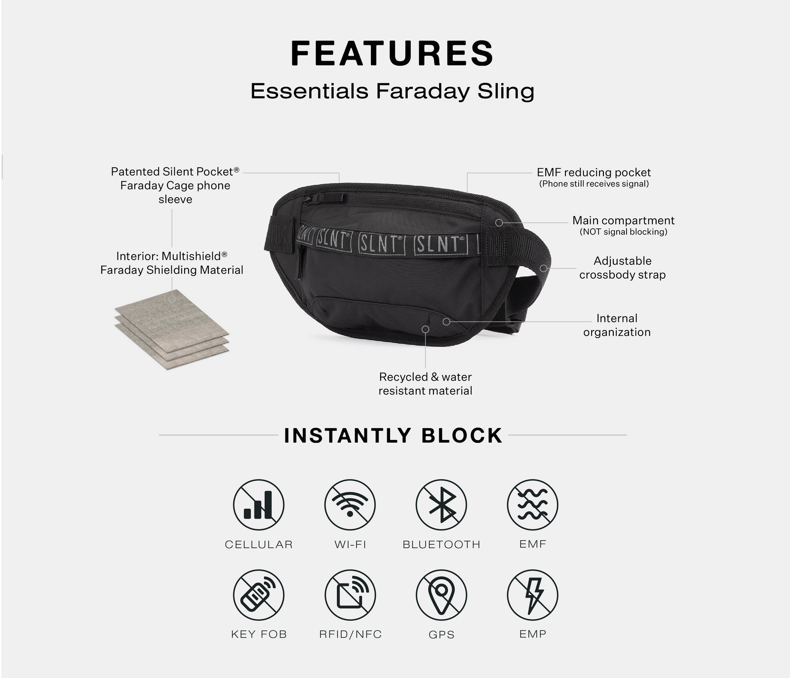 Seamlessly transition on and off the grid with the Essentials Faraday Sling. This minimalist design features an embedded patented signal-blocking Faraday Sleeve, that instantly disconnects your device, ensuring you're untraceable, untrackable, and unhackable. When you need to stay reachable, slip your phone into the designated phone slip-in pocket and feel confident that you are reducing your EMF radiation exposure.
