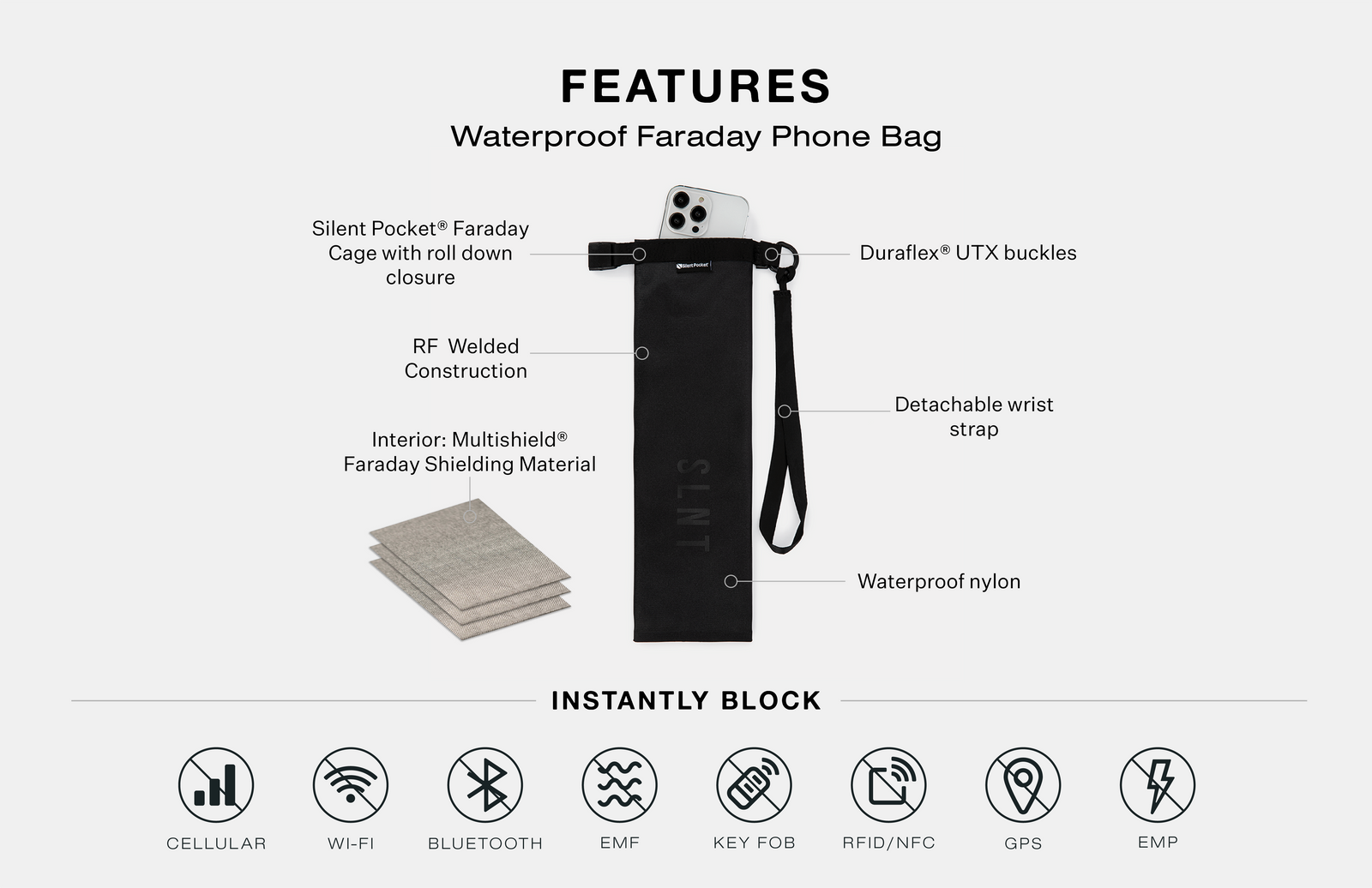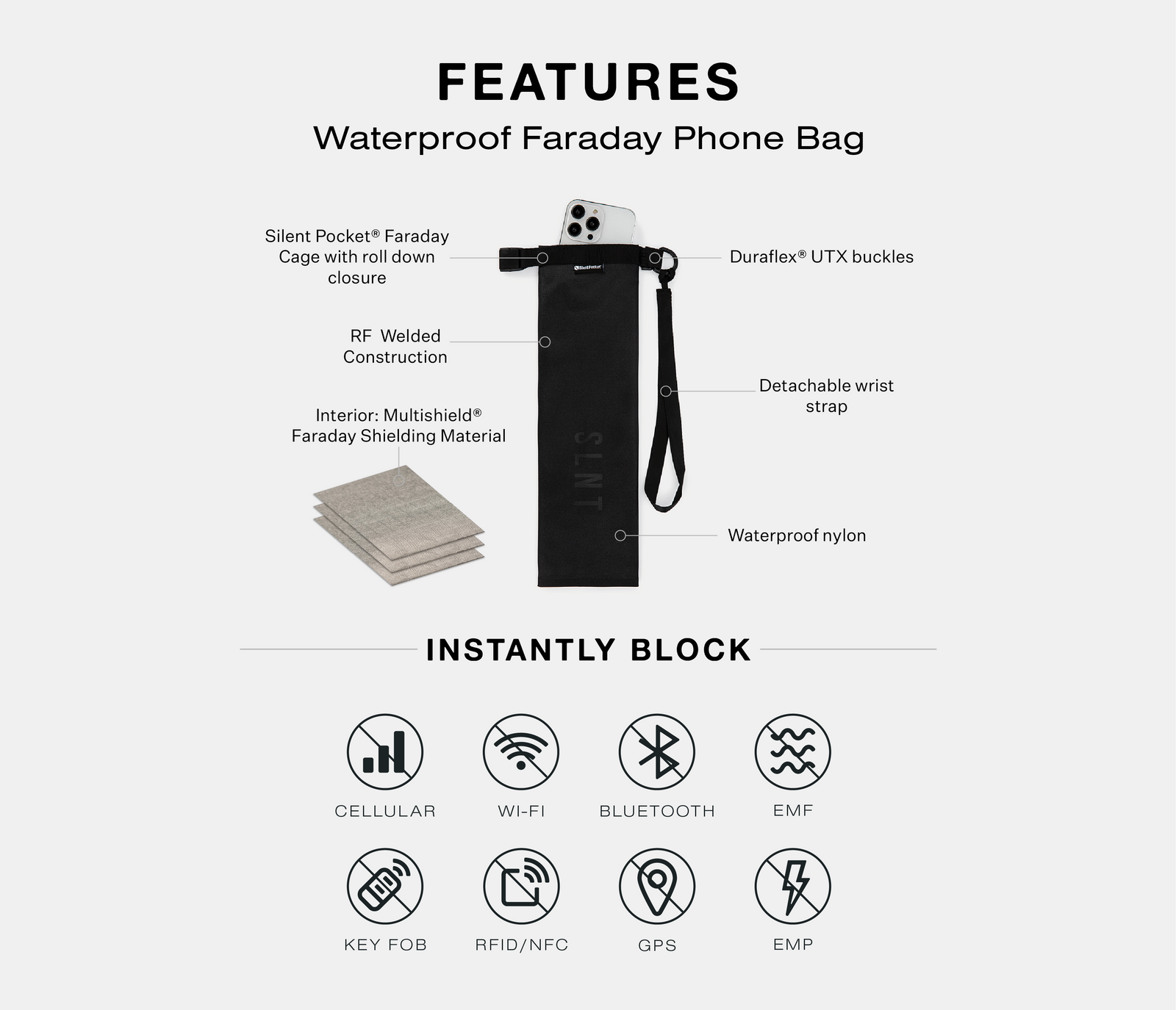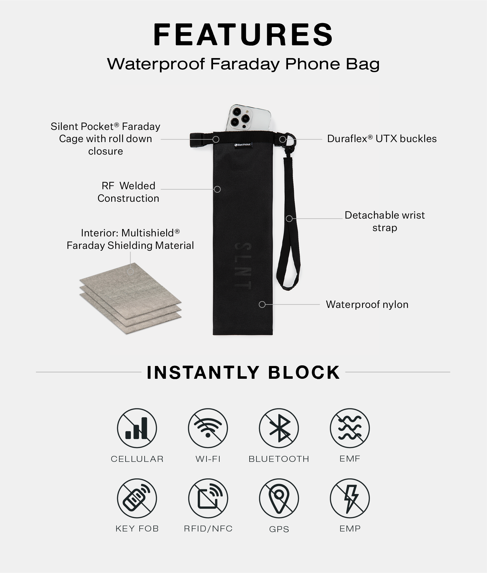 Silent Pocket® Faraday Technology Instantly Blocks: