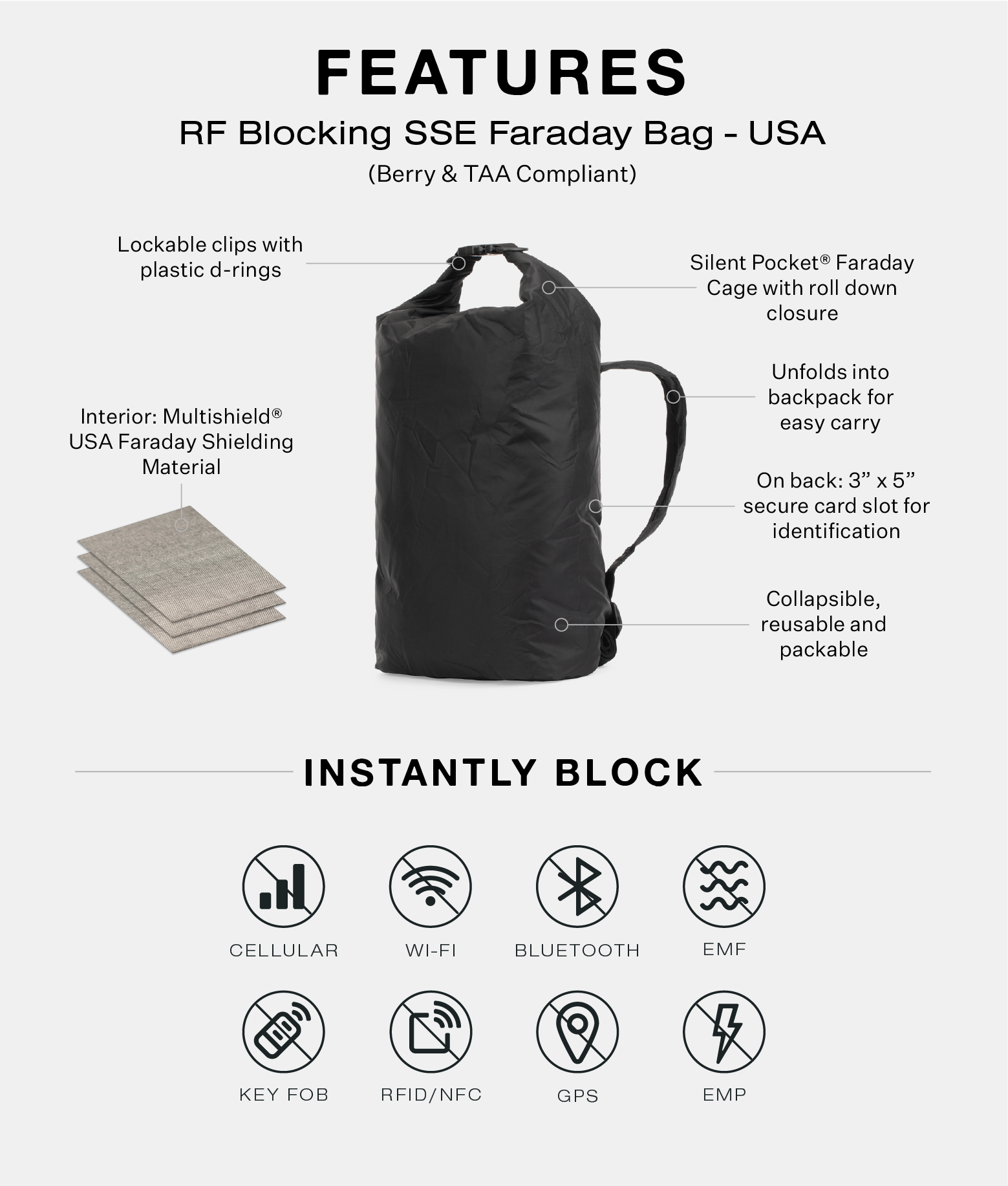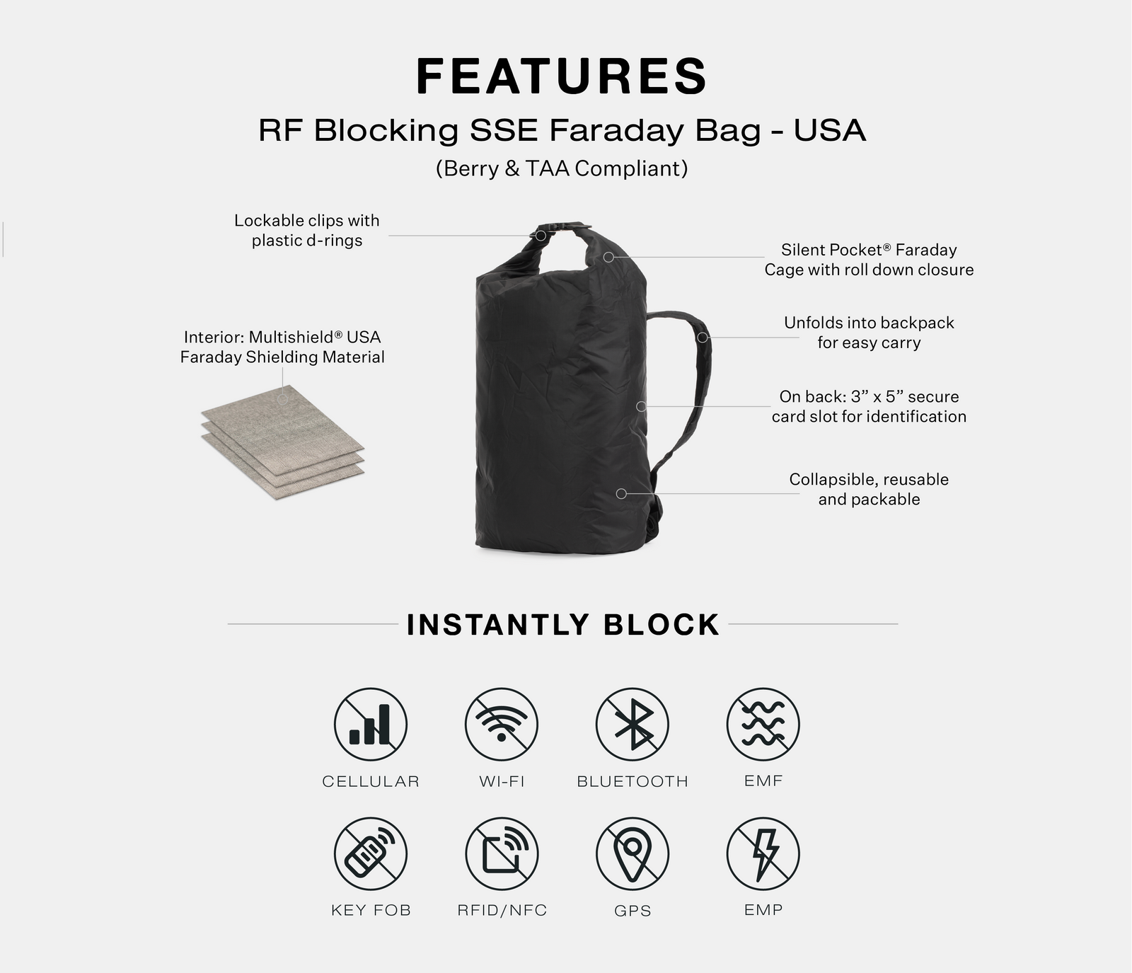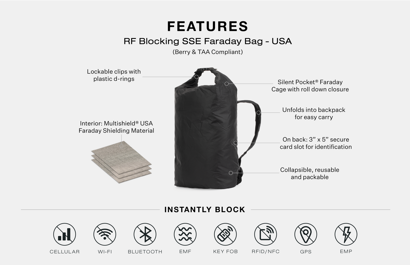 Introducing the RF Blocking SSE bag: Sensitive Site Exploitation bag the ultimate solution for discreet transportation and securing devices and digital evidence from being tracked, hacked, remotely wiped, monitored, or exploited. Our signal-blocking Faraday technology ensures your device is protected from RF signal transmission and signature management, safeguarding your privacy and security with confidence.