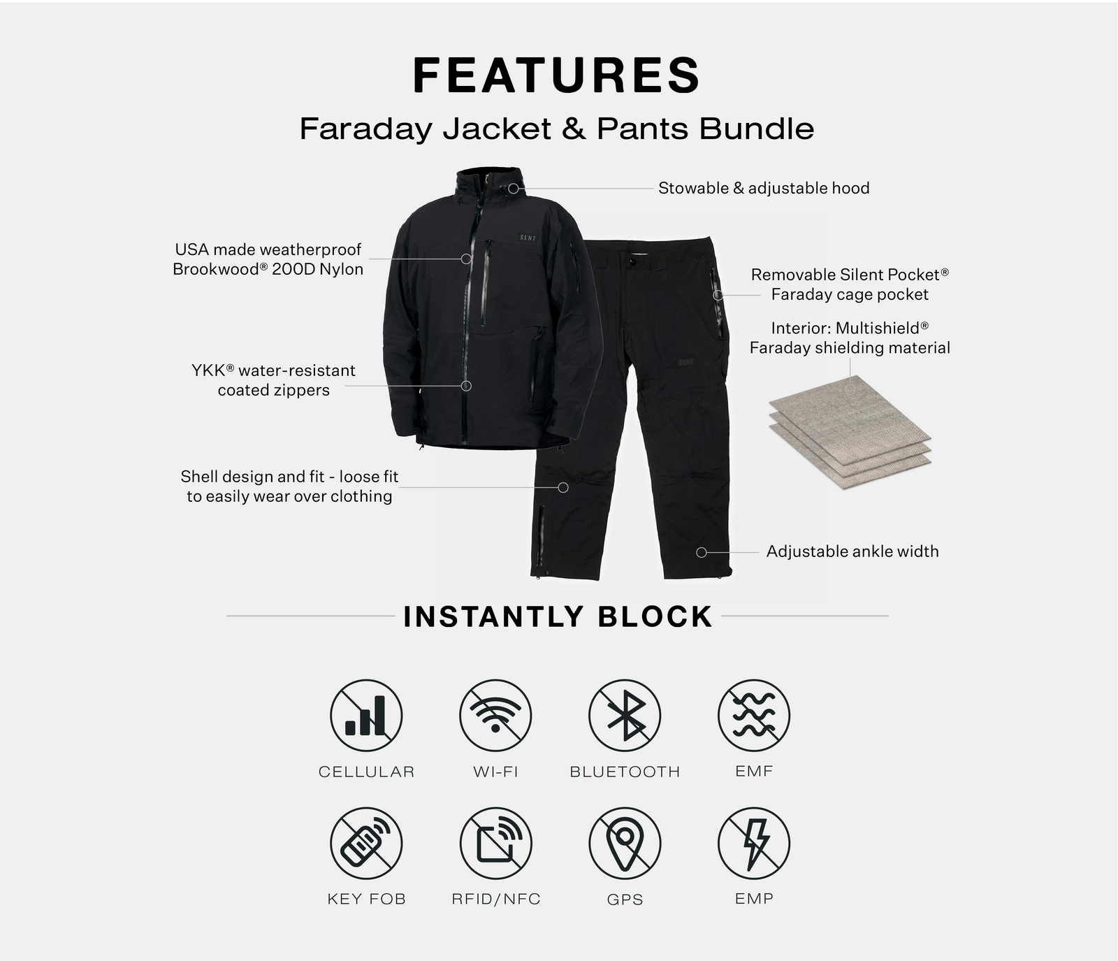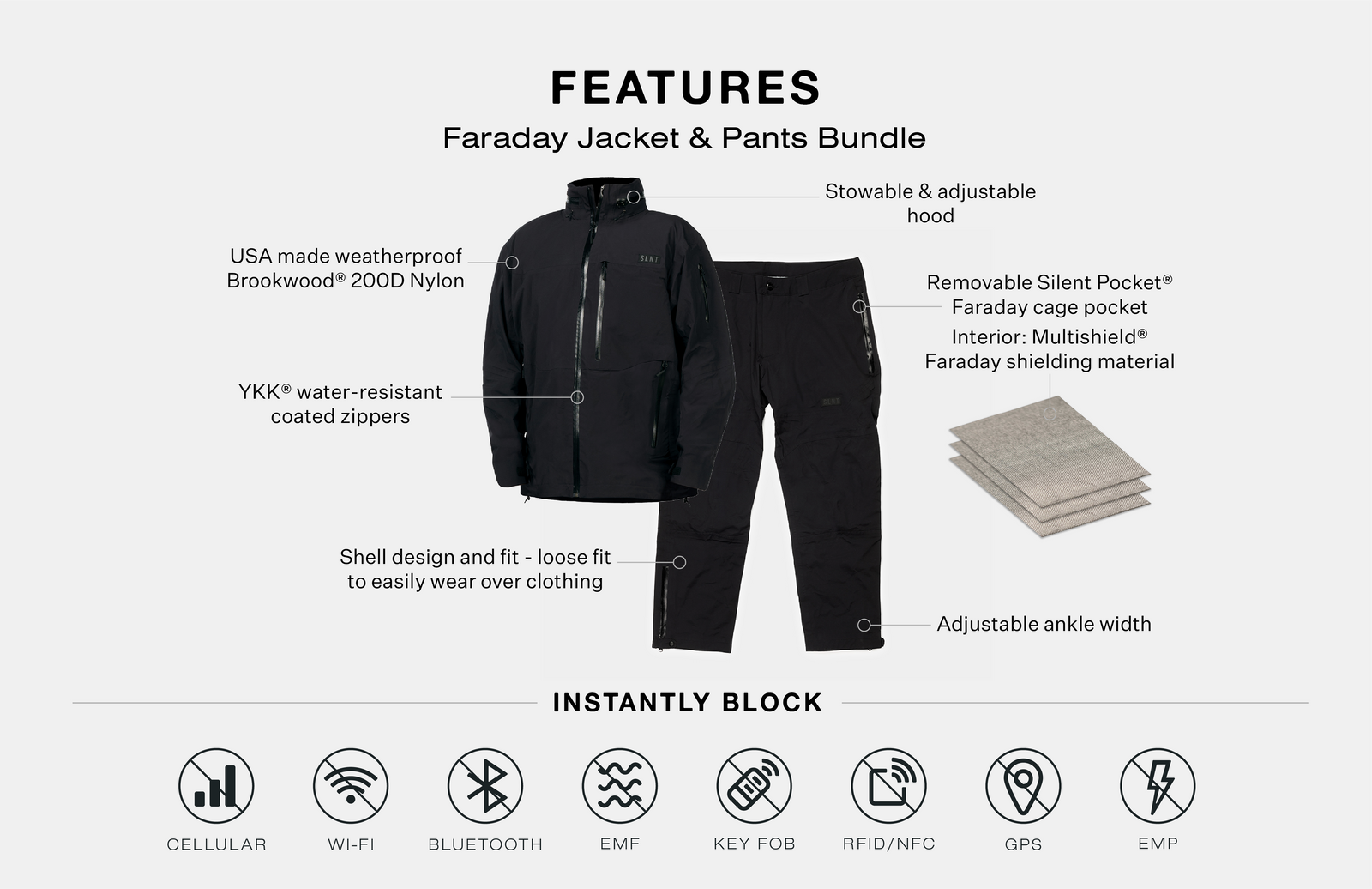 Proudly made in the USA and TAA compliant, this Faraday Jacket and Pant set is crafted from premium weatherproof Brookwood nylon with a high-density coating to shield you from the elements. Designed as durable shells to be worn over layered clothing, both pieces feature removable, patented signal-blocking Faraday pockets that block all wireless communication, safeguard your location, and protect against remote tampering and hacking.