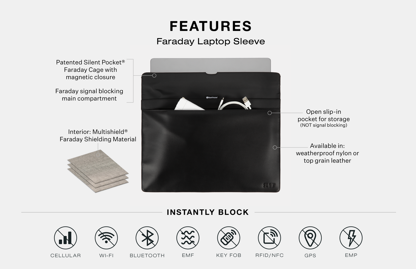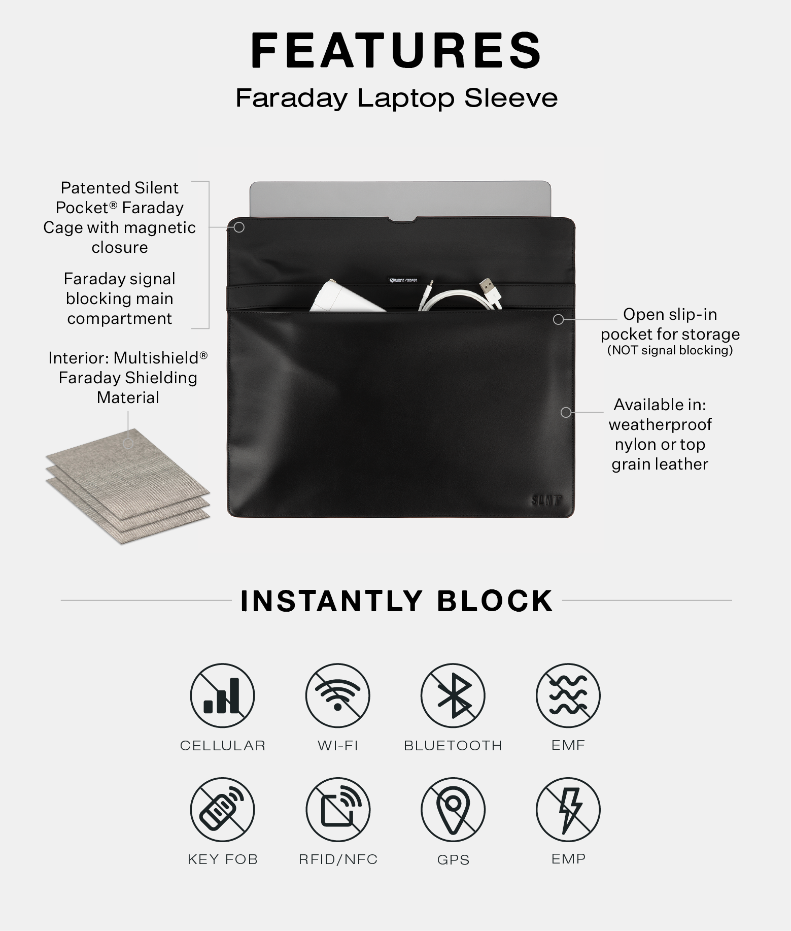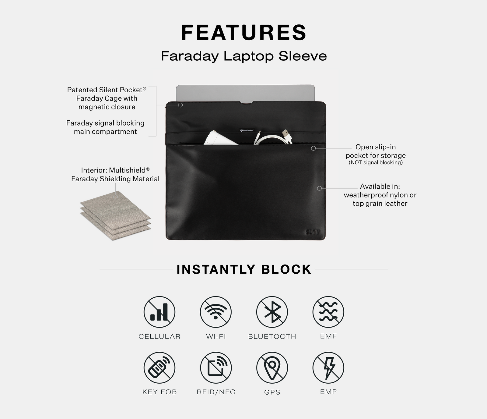 Silent Pocket® Faraday Technology Instantly Blocks:
