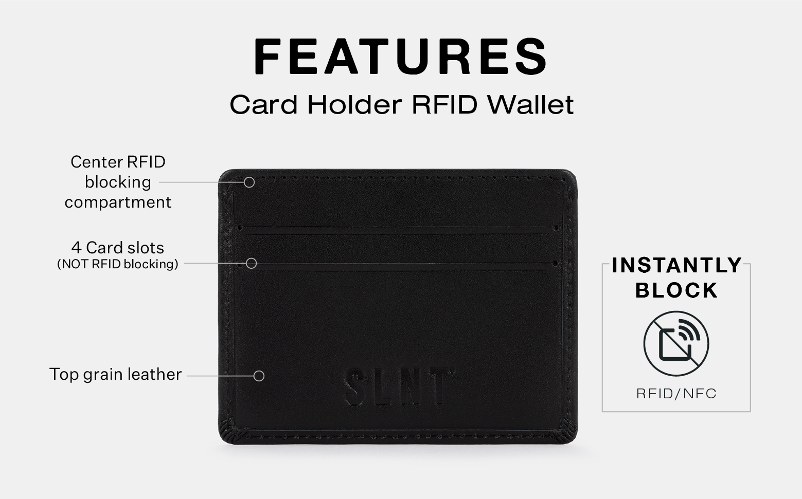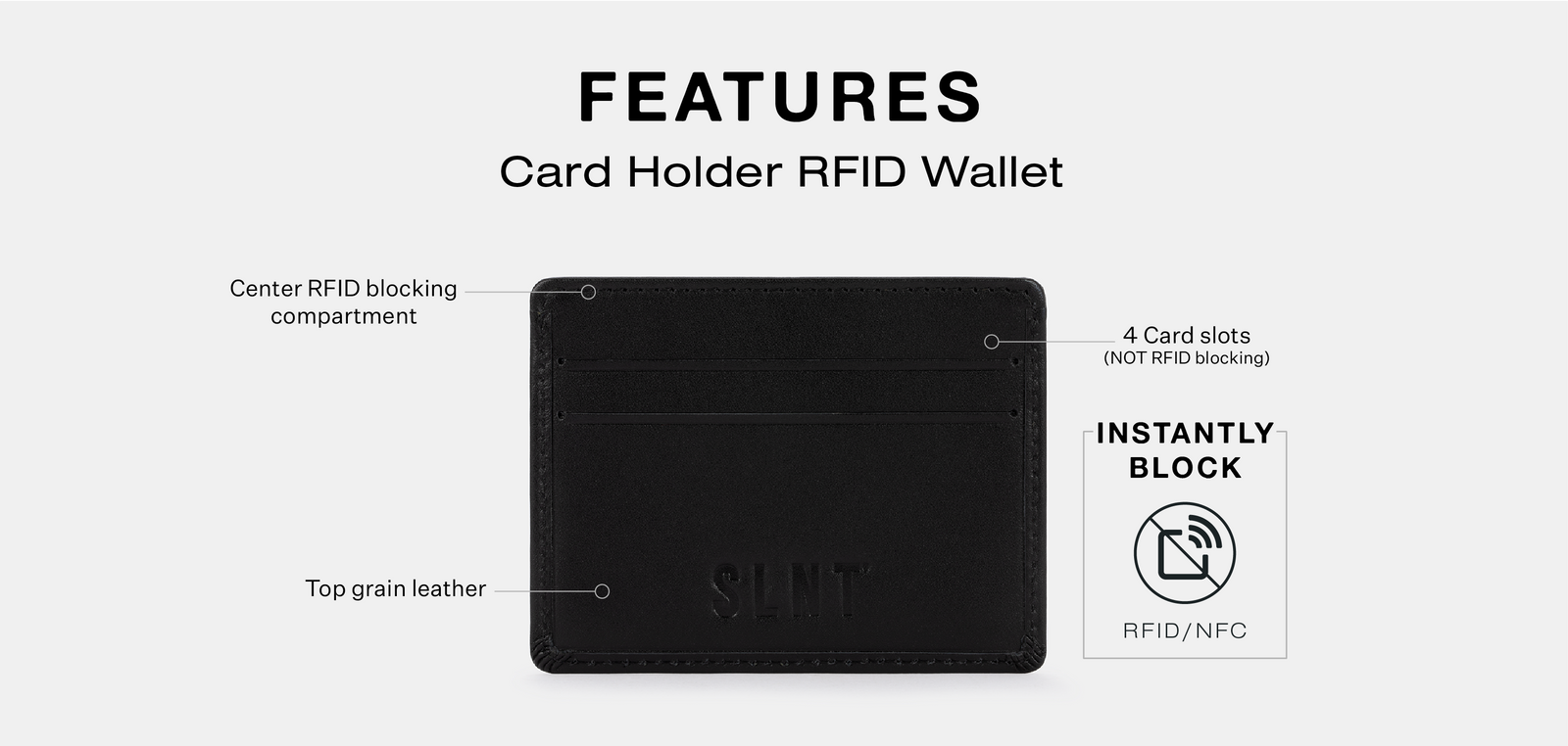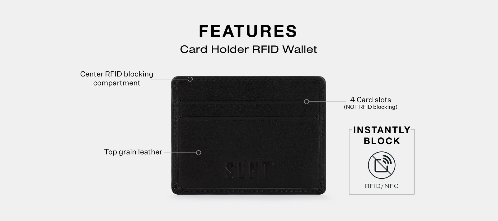 The perfect companion for business travelers and individuals on the move. Our sleek and compact RFID card holder wallet effortlessly fits into any bag, offering convenient portability wherever you go. With its built-in RFID-blocking technology, this wallet provides advanced security by safeguarding your sensitive card information from potential skimmers, and protecting against credit card and identity theft.