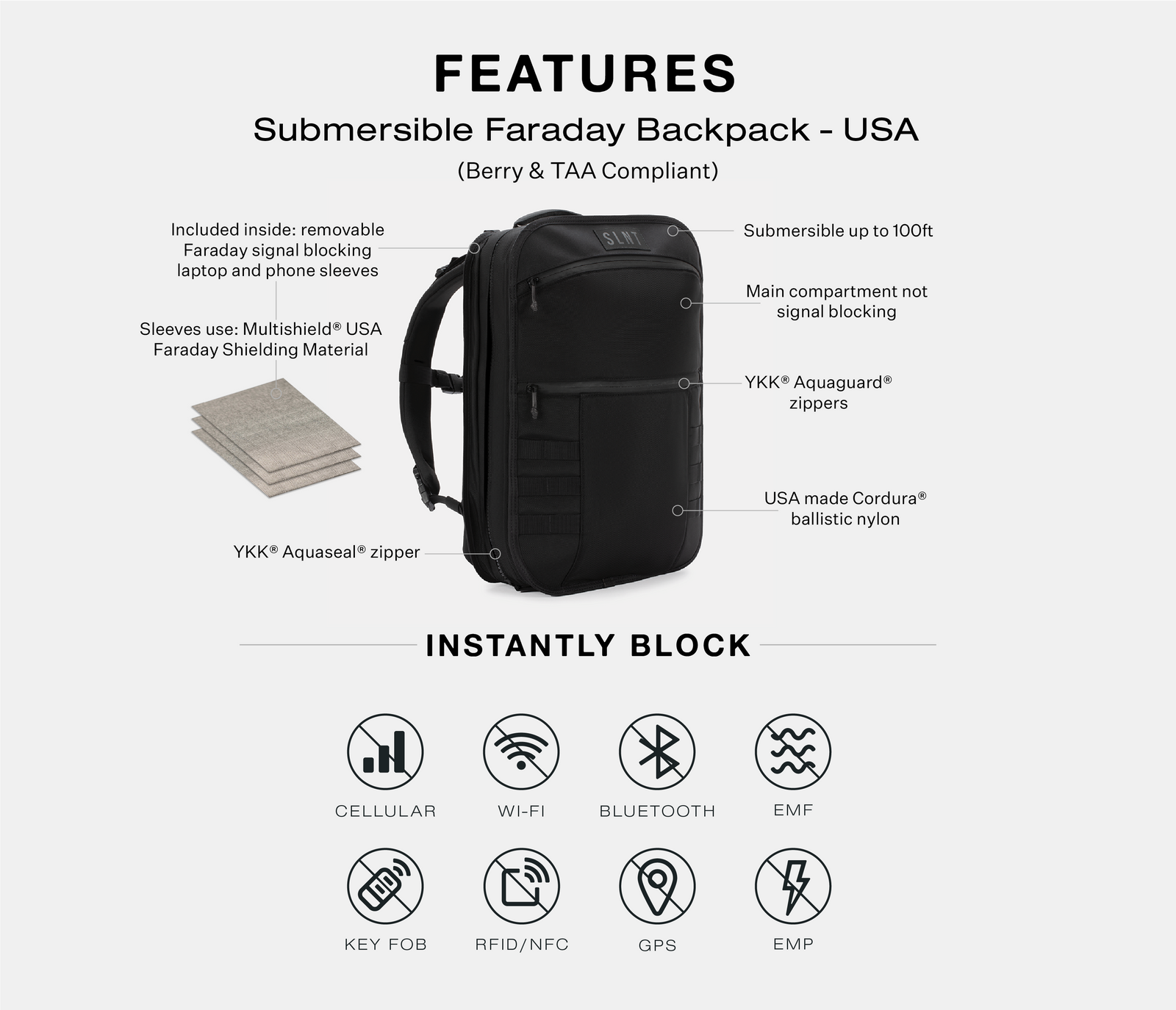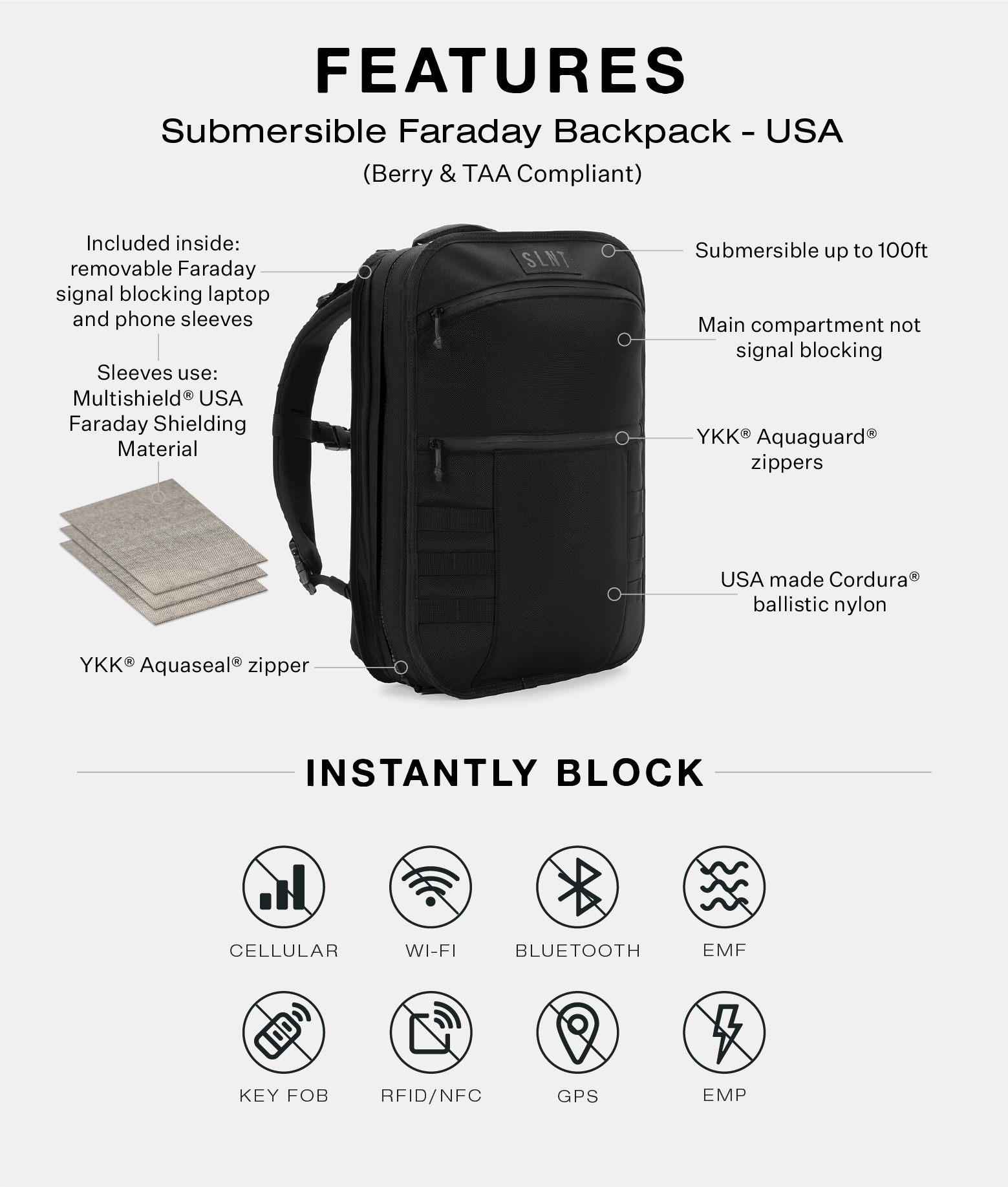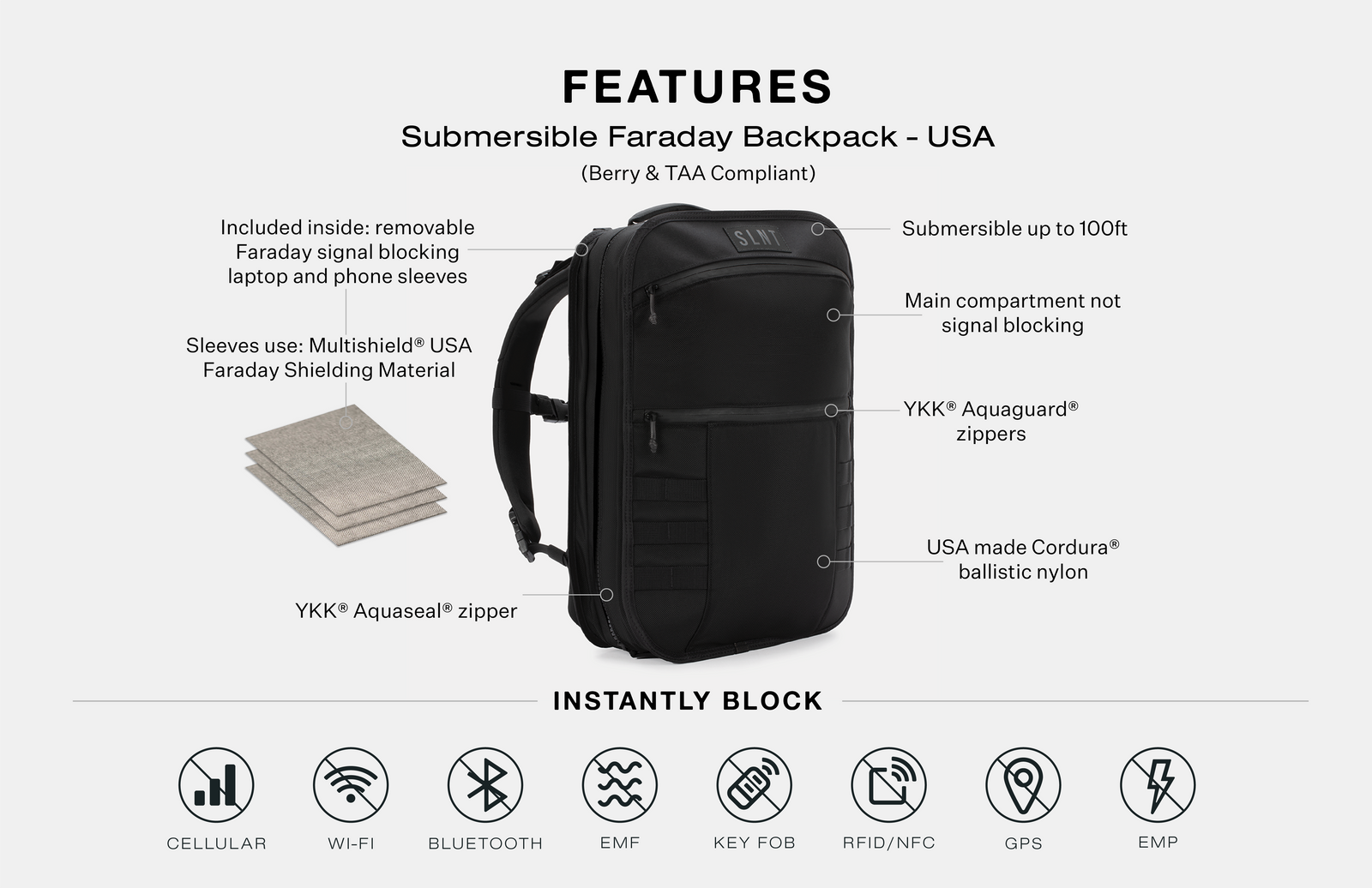 Proudly made in the USA (Berry and TAA Compliant), our Submersible Faraday Backpack is crafted with ultra-durable 1050D Cordura® PU-Coated Water Resistant Ballistic Nylon, ensuring it can withstand any terrain and weather conditions effortlessly. With its submersible capability of up to 100ft in water, it offers reliable protection in various environments.